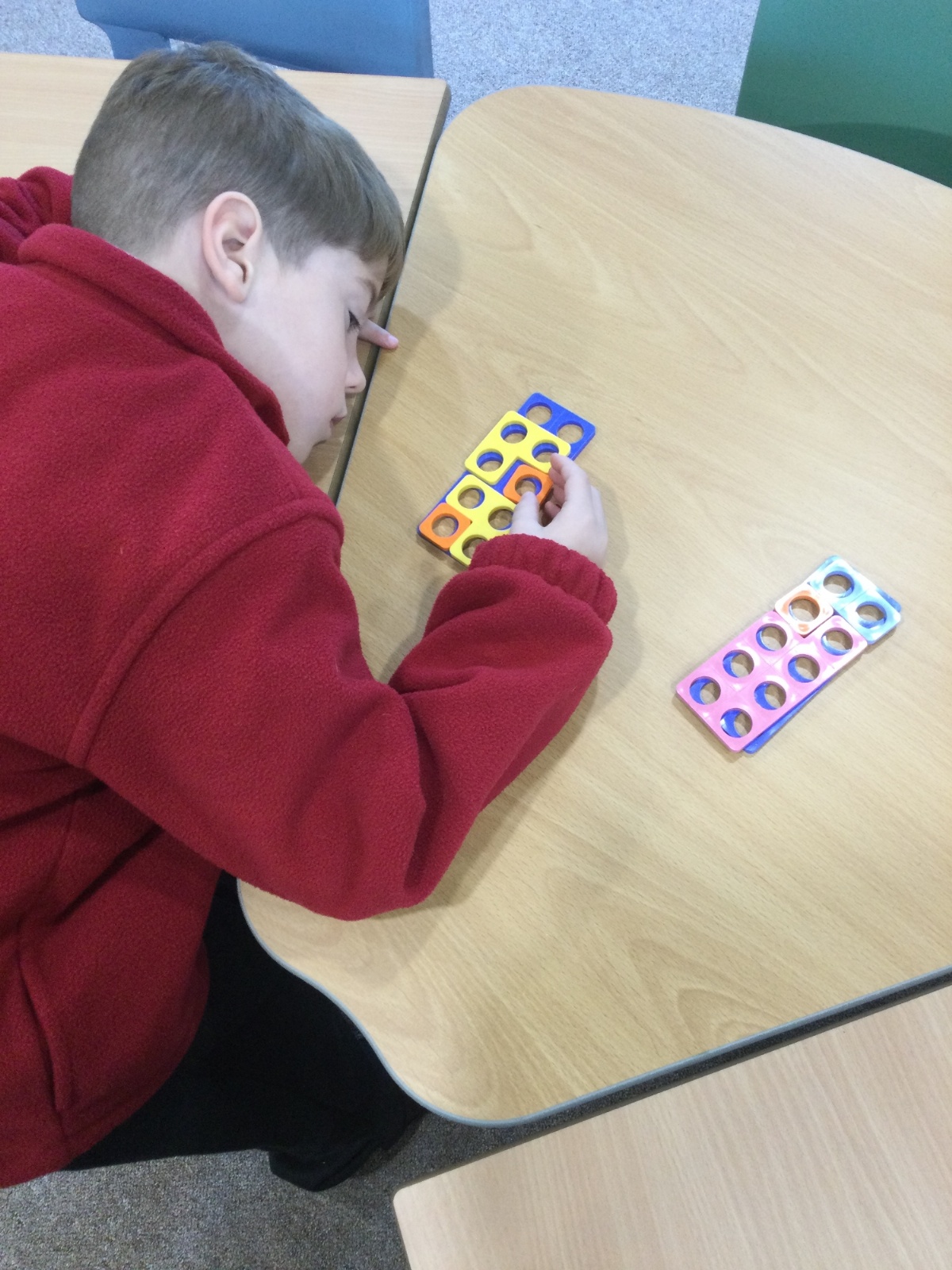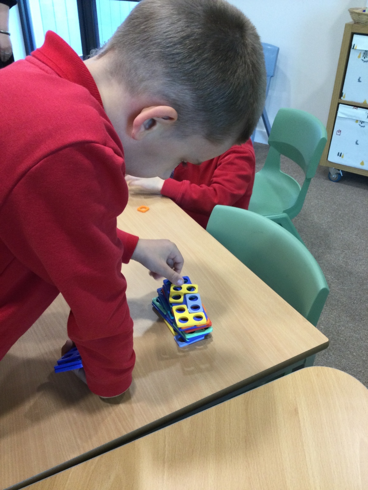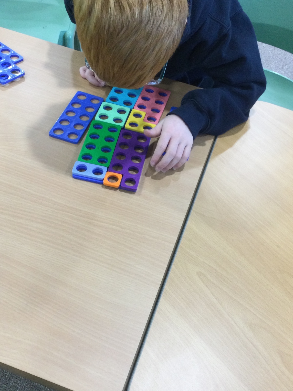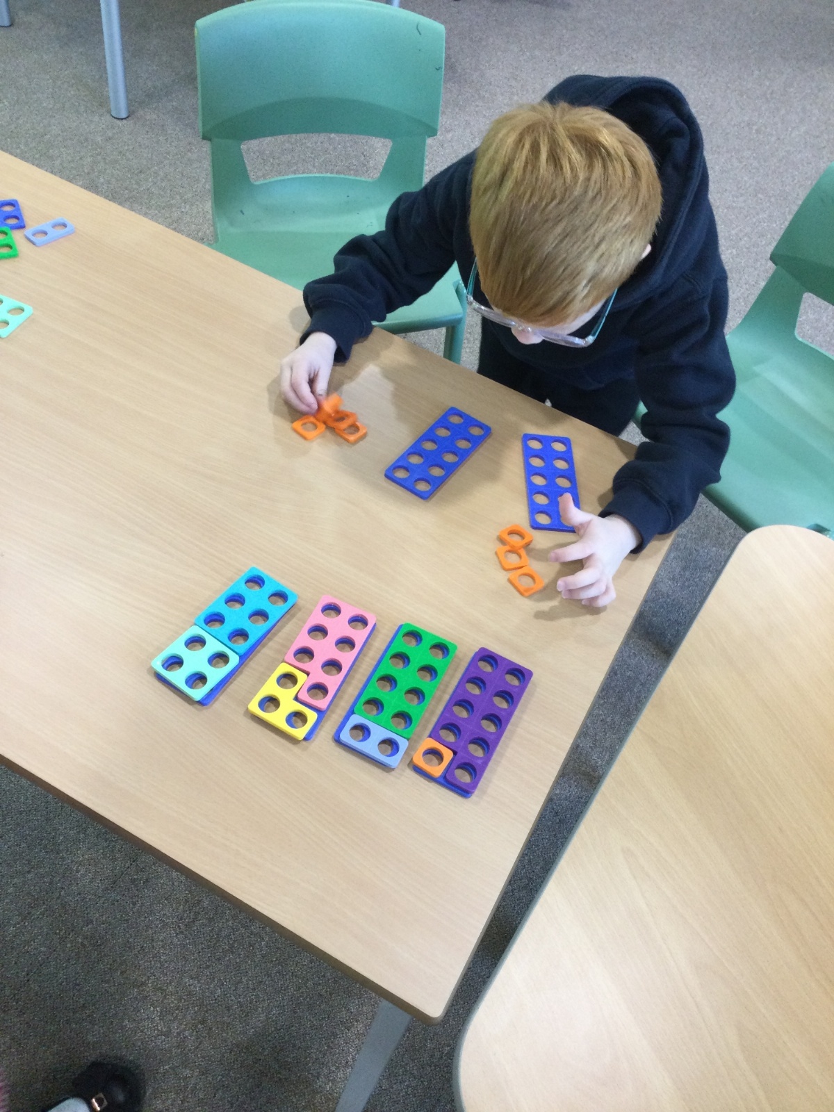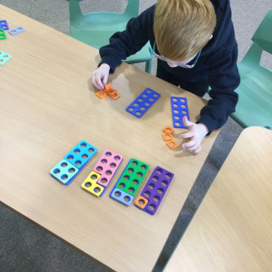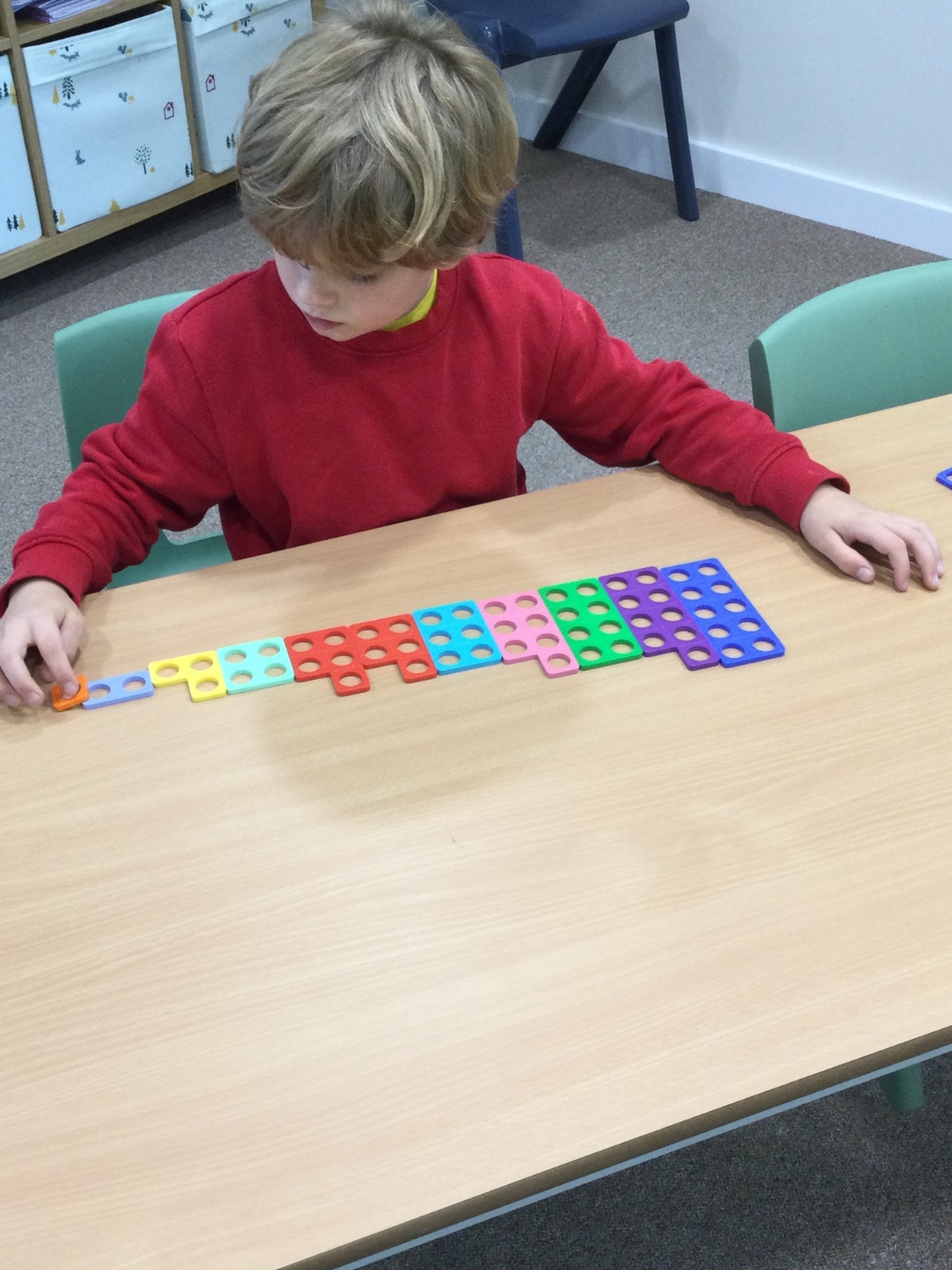 Have a look at some of our practical maths activities where we use concrete objects to explore mathematical concepts. We have used Numicon to find all the number bonds to 10. When learning about 3D shapes we really thought about the question around what makes a shape 3D. Can a picture on paper really be 3D? We explored nets of 3D shapes and used these to make our own boxes to create a group skyline. We followed a line of interest around measurement and carefully ordered our book collection by height.
