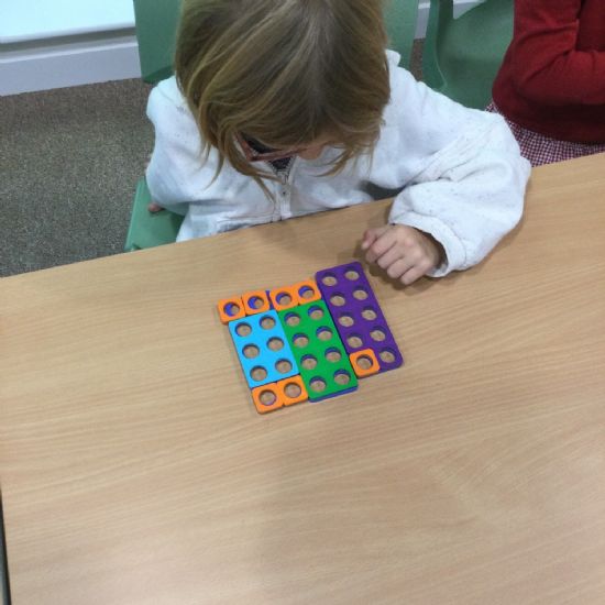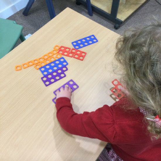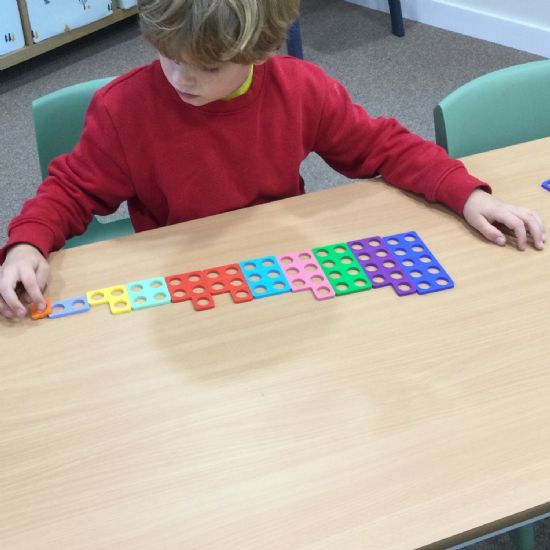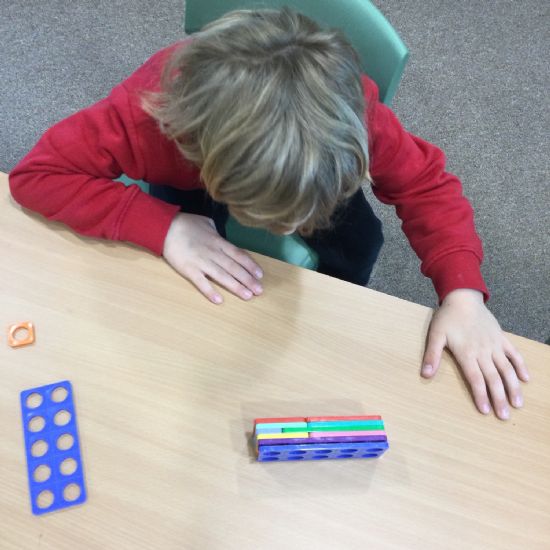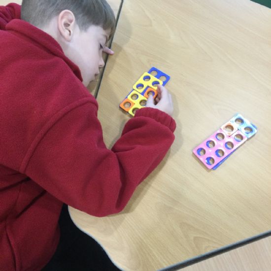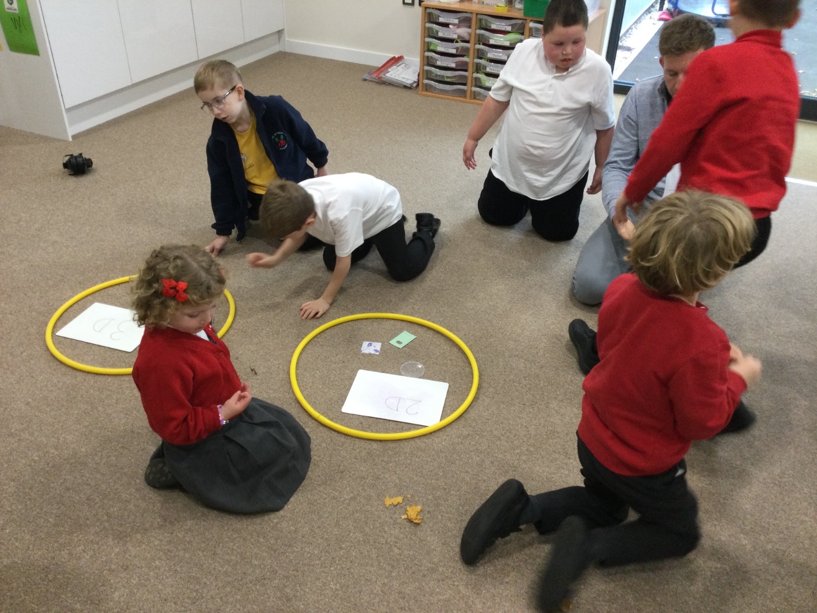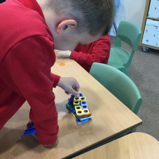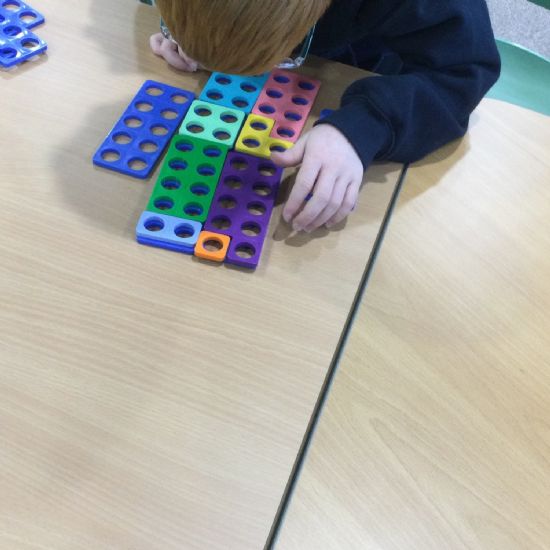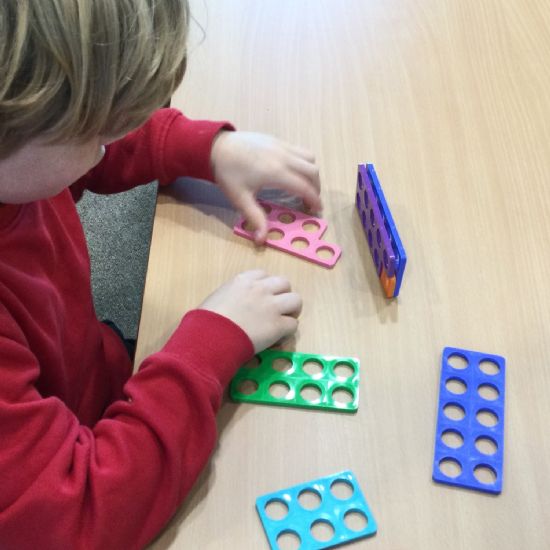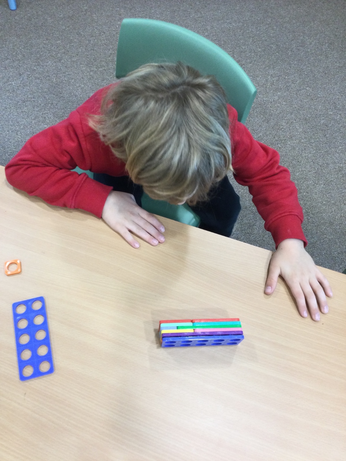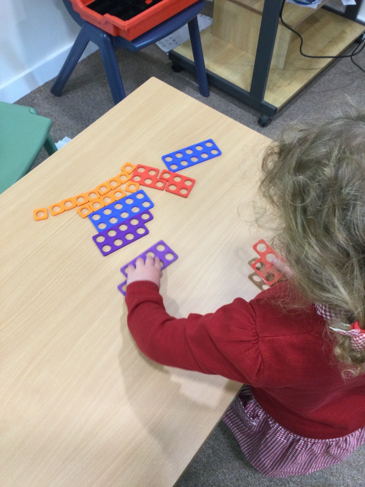 Have a look at some of our practical maths activities where we use concrete objects to explore mathematical concepts. We have used Numicon to find all the number bonds to 10. When learning about 3D shapes we really thought about the question around what makes a shape 3D. Can a picture on paper really be 3D? We explored nets of 3D shapes and used these to make our own boxes to create a group skyline. We followed a line of interest around measurement and carefully ordered our book collection by height.